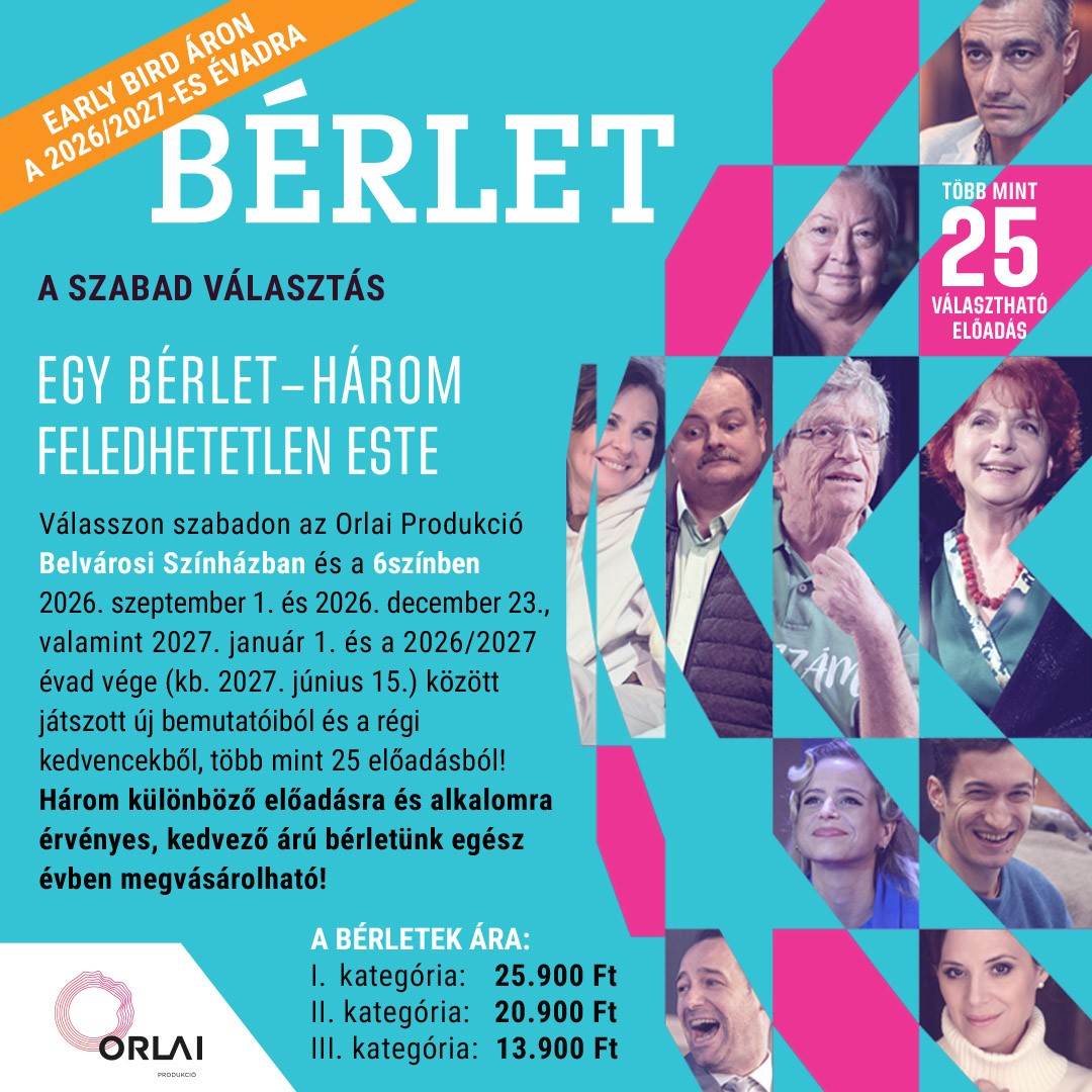 Ha most megvásárolja a 2026/2027-es évadra szóló, az Orlai Produkció három különböző előadására érvényes, a Belvárosi Színházban és a 6színben felhasználható bérletét, extra ajándékként egy 50%-os jegyvásárlásra feljogosító kupont adunk!